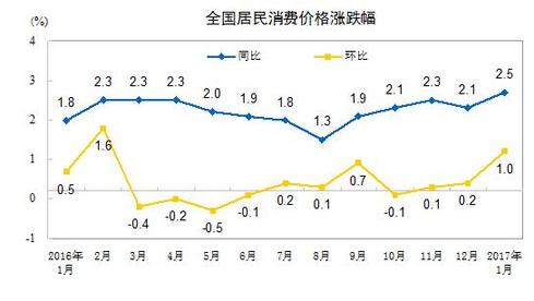 2017年1月份,全国居民消费价格总水平同比上涨2.5%。其中,城市上涨2.6%,农村上涨2.2%;食品价格上涨2.7%,非食品价格上涨2.5%;消费品价格上涨2.2%,服务价格上涨3.2%。