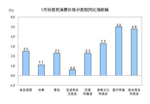 1月份,其他七大类价格同比均有所上涨。其中,医疗保健、其他用品和服务、教育文化和娱乐、居住、交通和通信、衣着、生活用品及服务价格分别上涨5.0%、4.8%、3.3%、2.3%、2.3%、1.1%和0.6%。