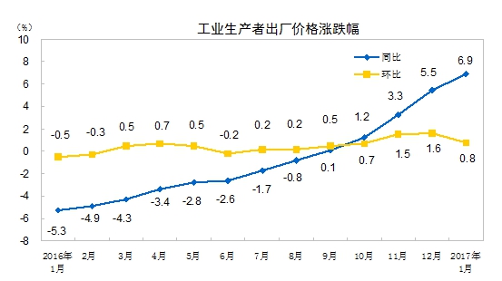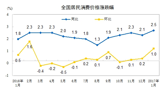 国家统计局当天率先公布了1月份全国居民消费价格指数(CPI)和工业生产者出厂价格指数(PPI):CPI环比上涨1%,同比上涨2.5%;PPI环比上涨0.8%,同比上涨6.9%。