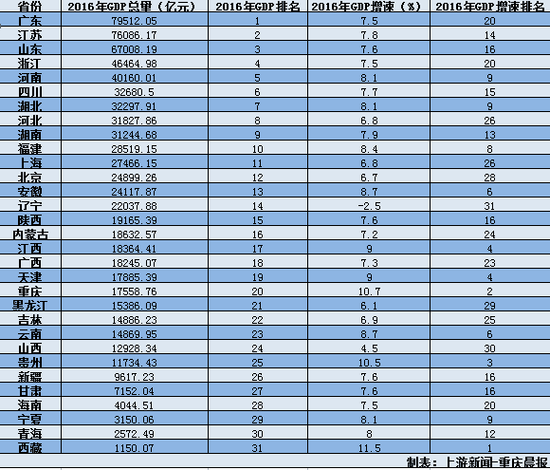 GDP排行:广东经济总量位居第一 重庆增速达10.7%