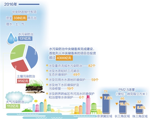 来自财政部官网的消息,中央财政2016年拨付专项资金338亿元用于治理水、土、气。其中,在水污染防治方面拨付专项资金131亿元,土壤污染防治95亿元,大气污染防治112亿元。继去年“土十条”发布之后,三大治污攻坚战全面打响。那么,助力治污的真金白银是如何投下去的,又产生了怎样的效果?伴随治污攻坚向纵深发展,哪里又将成为治污投入的新“战场”?就上述问题,记者作了深入采访。