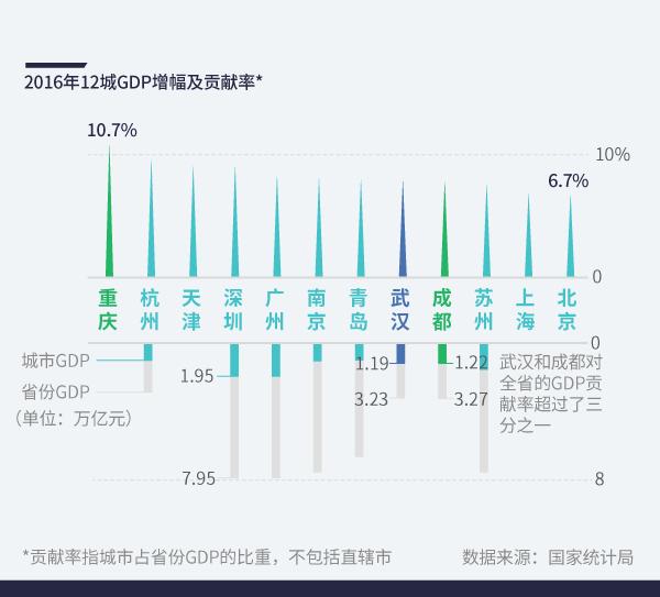 2006年,上海成为中国最早突破GDP万亿门槛的城市。很快,2008年,北京跨过门槛;2010年,广州加入这一行列;2011年,深圳、重庆、苏州和天津4个城市一道完成突破;2014年,中西部两个重要城市——武汉和成都也突破万亿;2015年,杭州迎头赶上;2016年,青岛和南京跻身“万亿俱乐部”。