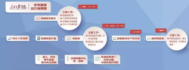 在这样的组织架构下,人民日报社相应地配套了完整的运行机制,包括总编辑协调会、采前会等。每周一下午,总编辑召开协调会,部署当周重要宣传任务,讨论重大报道选题,点评一周传播效果及协调采编对接联动。总编协调会是“中央厨房”日常运行的最高决策机构。与此同时建立采前会制度,由当天值班的副总编辑主持,每天上午召开,三大中心和报社采访部门的负责人参加,汇报选题策划、通报新闻线索,研究当日舆情,确定重点稿件,布置采编对接。取消下午的编前会,只保留晚上的夜班报纸编前会。