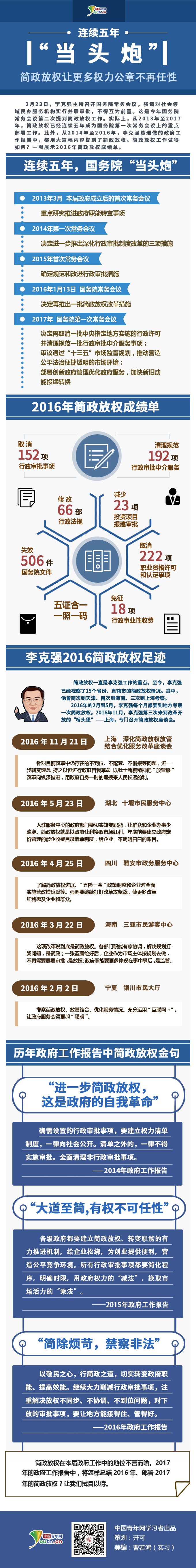 2月23日,李克强主持召开国务院常务会议,强调对社会领域民办服务机构实行并联审批,不得互为前置。这是今年国务院常务会议第二次提到简政放权工作。实际上,从2013年至2017年,简政放权已经连续五年成为国务院第一次常务会议上的重点部署工作。此外,从2014年至2016年,在李克强总理做的政府工作报告中,都用大篇幅内容提到了简政放权。简政放权工作做得如何?一图展示2016年简政放权成绩单。(记者 开可)