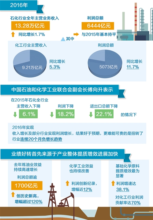 来自中国石油和化学工业联合会的信息显示,2016年,石化行业全年主营业务收入13.28万亿元,同比增长1.7%,利润总额6444亿元,与2015年基本持平;其中化工行业主营收入9.21万亿元、同比增长5.3%,利润总额5073亿元、同比增长11.7%。中国石油和化学工业联合会副会长傅向升表示,在2015年石化全行业主营收入下降6.1%、利润下降18.2%、进出口总额下降22.1%的情况下,2016年实现收入增长及部分行业实现利润增长,结果好于预期。更难能可贵的是,扭转了行业连续20个月负增长趋势。
