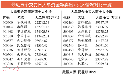 截至昨日收盘,A股大单资金净流入个股中,中小板格林美位居第一,当天大单资金净买入4.73亿元。其次是创业板公司机器人,该公司周一放量涨停,大单净买入2.74亿元。而前期表现较强的安信信托、万科A、京东方A、中国化学、中国建筑、中国交建以及中国银行等大盘权重股纷纷遭到大单资金的净减持。如果按过去5个交易日数据计算,在大单资金净流入前十大个股中,中小板和创业板占了八成席位。