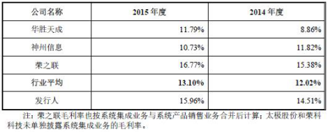 在系统集成业务毛利率方面,海量数据与同样核算方法的上市公司荣之联比较,2014年和2015年,海量数据该项业务毛利率为16.75%和17.82%,低于荣之联的17.18%和18.58%。