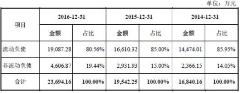 2013年至2016年,公司负债水平逐年上升,分别为11,439.11万元、16,840.16万元、19,542.25万元、23,694.16万元。公司资产负债率分别为64.46%、61.95%、59.77% 和58.57%,呈下降趋势。但仍高于同行业可比上市公司平均水平,流动比率及速动比率低于同行业可比上市公司平均水平。