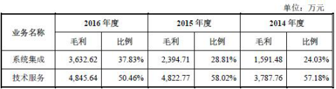 公司主营业务毛利主要来源于系统集成和技术服务两类业务,上述两类业务的毛利比重为81.21%、86.82%和88.29%。