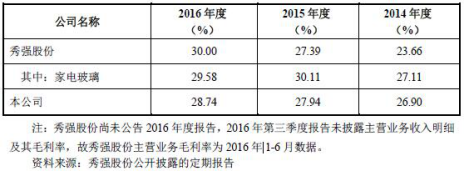 2014至2016年与同行业可比公司的主营业务毛利率对比(来源:招股书)