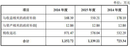 2013年至2016年,政府补助合计分别为669.05万元、723.34万元、1,139.11万元、1,152.72万元。