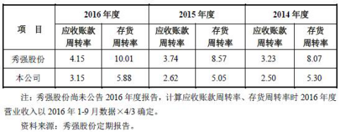 2014至2016年可比上市公司应收账款周转率和存货周转率对比(来源:招股书)