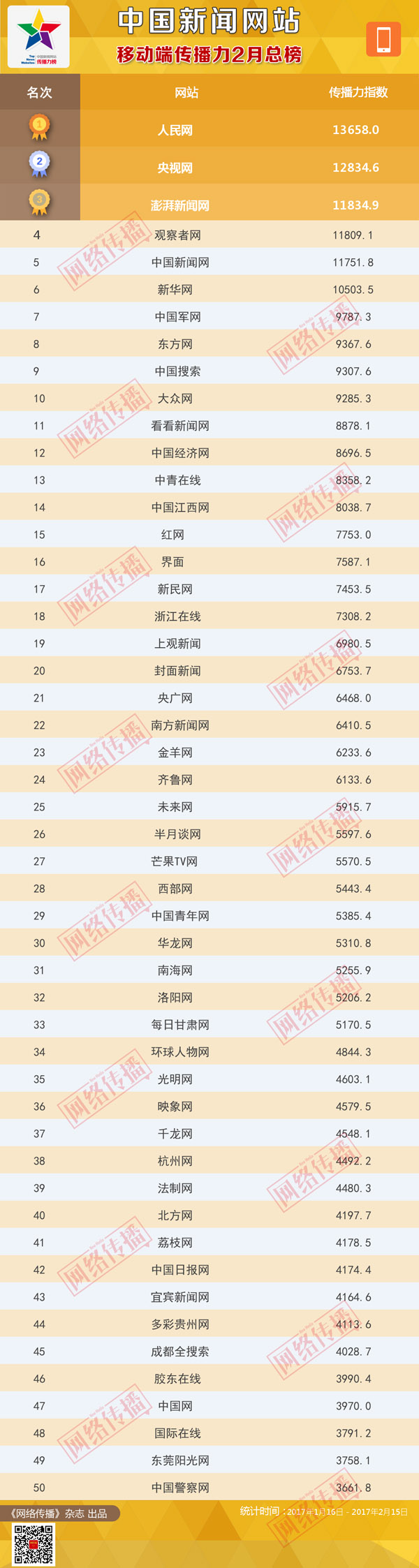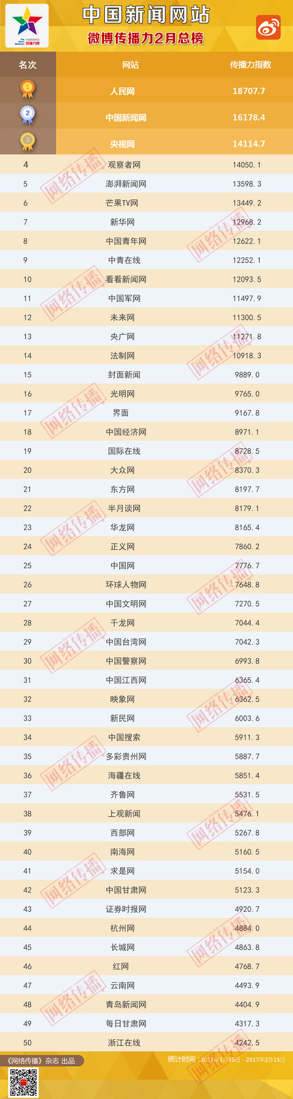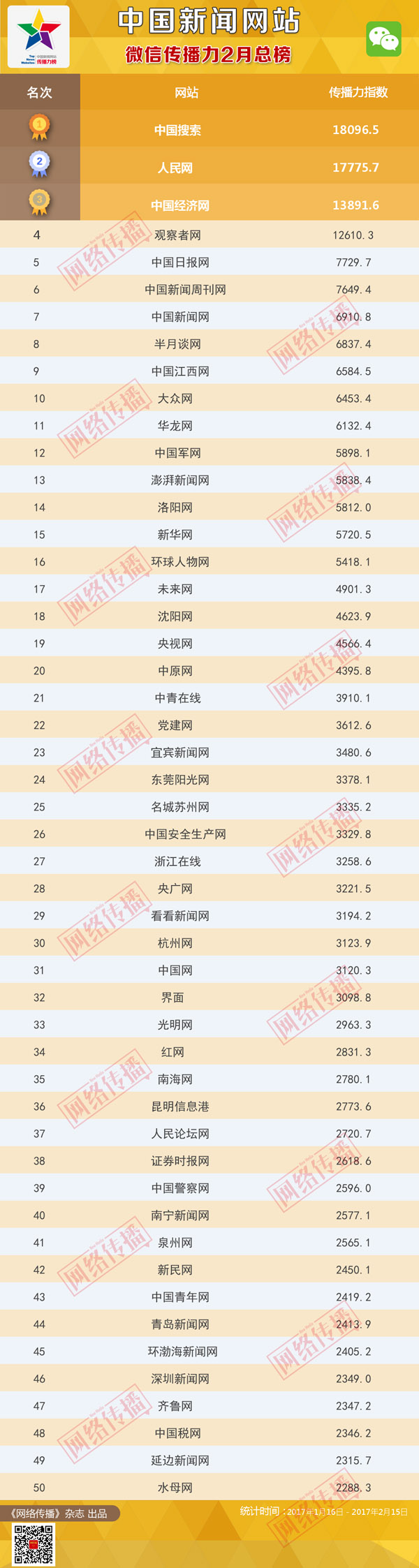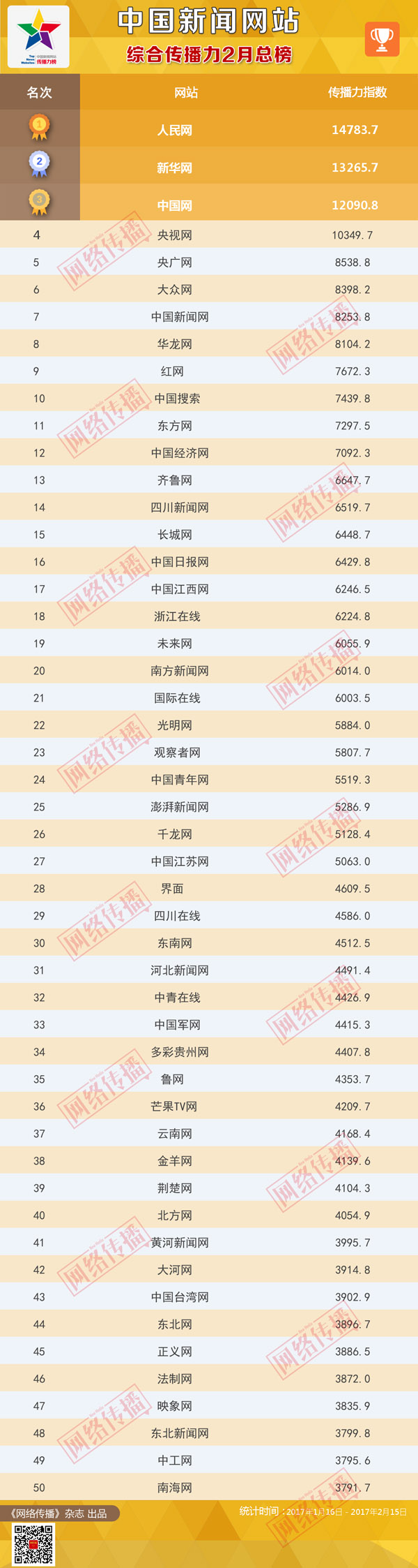 中央网信办《网络传播》杂志倾力打造的“中国新闻网站传播力2017年2月总榜”今日发布。
