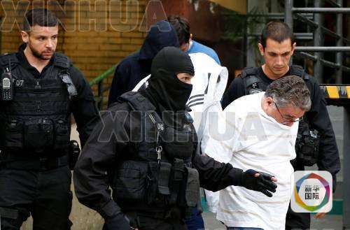 图为在巴西库里蒂巴,警察17日押送几名涉案人员离开司法科。