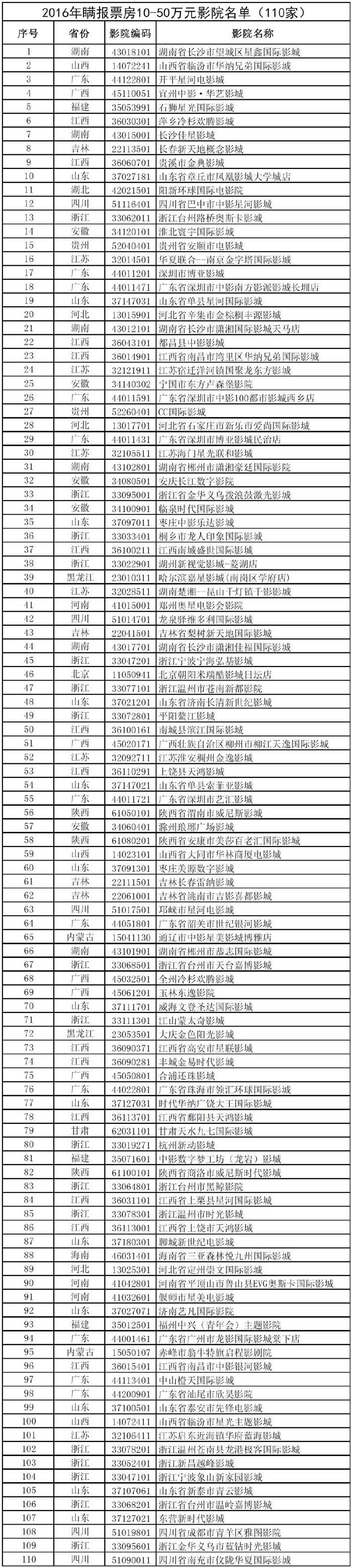 三、对湖南省长沙市望城区星鑫国际影城等110家瞒报票房在10万元至50万元之间的影院,处以20万元的罚款。