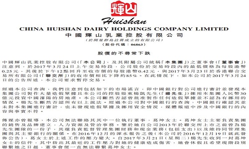 同时,辉山乳业还对市场传闻的公司执行董事葛坤“失联”的情况予以澄清说明。辉山乳业在公告中称,葛坤主要负责集团的销售及品牌建立,人力资源及管治事务。鉴于葛坤自公司2013年于港交所上市之前曾为杨凯团队的一份子,其还负责监督管理集团财务和现金业务(包括支出)以及维护同管理集团与其主要银行的关系。在2016年12月的浑水报告之后,葛坤于上述工作的压力变大。自2017年3月21日,杨凯收到一封葛坤的信件,其中指出其最近的工作压力对她的健康造成伤害,葛坤会休假且希望现阶段别与其联系,随后董事会便一直无法与葛坤联络。