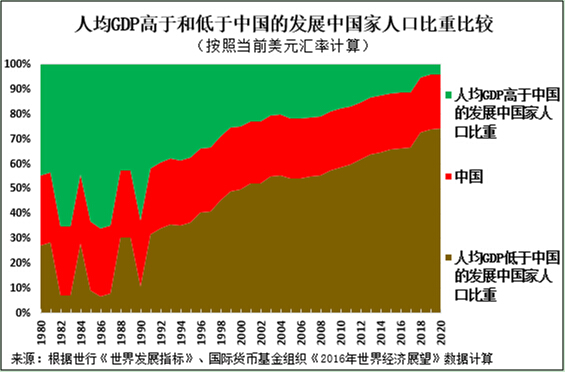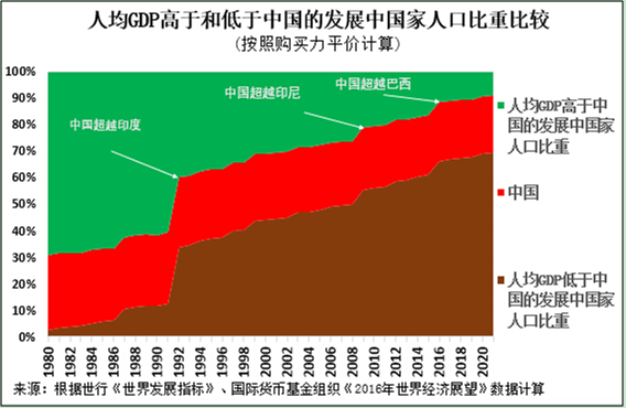 • 按照购买力平价计算,1980年,人均GDP高于中国的发展中国家人口比重为69%,人均GDP低于中国的发展中国家人口比重仅为2%。2016年,形势完全逆转了。