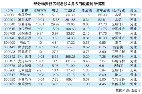 4月25日9点25分集合竞价一出来,共有包括金隅股份、京汉股份、河钢股份等16只雄安新区概念股涨停,且封单超过10亿元,其中,金隅股份、华夏幸福以及冀东水泥,封单均超100亿元。