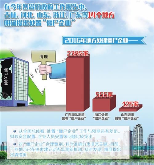 “僵尸企业”清理正在加速。据了解,在今年的各省份政府工作报告中,吉林、河北、山东、浙江、广东等14个地方明确提出处置“僵尸企业”。各地去年处置“僵尸企业”的成绩单也纷纷晒出:广东淘汰出清2385家国有“僵尸企业”,浙江处置555家“僵尸企业”,山东125家省管“僵尸企业”退出……