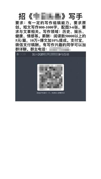 QQ群里有号主打出广告招聘写手,以文章阅读数计酬。