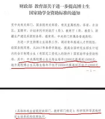 日前,西安交通大学、中央财经大学、上海财经大学、大连海事大学等多所高校研究生院发布消息: 依据《财政部教育部关于进一步提高博士生国家助学金资助标准的通知》(财科教〔2017〕5号)文件要求,从2017年春季学期起,提高全国研究生招生计划内的全日制博士生(有固定工资收入的除外)国家助学金资助标准,其中中央高校博士生从每生每年12000元提高到15000元,即每生每月提高250元。