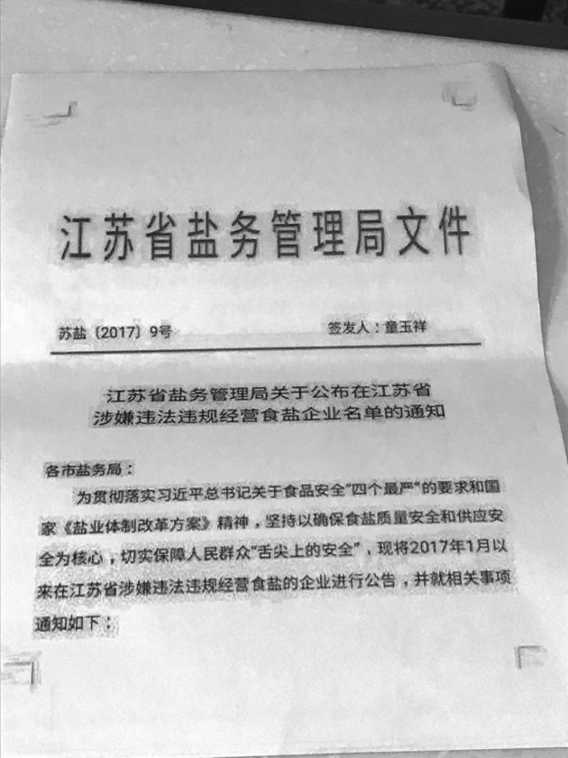 据此前中国食品安全网转载报道,以及中盐东兴盐化股份有限公司(以下简称中盐东兴)提供的一份复印件显示,今年3月,江苏省盐务管理局(以下简称江苏盐务局)下发了一则《江苏省盐务管理局关于公布在江苏省涉嫌违法违规经营食盐企业名单的通知》(以下简称《通知》),上海市盐业公司(以下简称中盐上海)、中盐东兴等数家江苏省外企业榜上有名。
