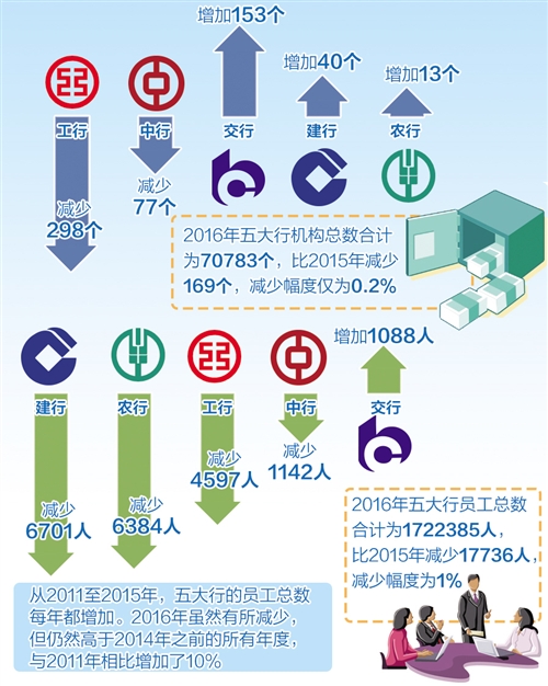 年报显示,2016年五大行机构总数合计为70783个,比2015年的70952减少169个,降幅0.2%。“线下网点的总量未来会压缩,功能从结算交易型向营销智能服务型转变。”易会满说。