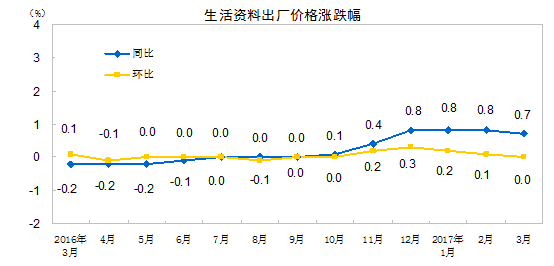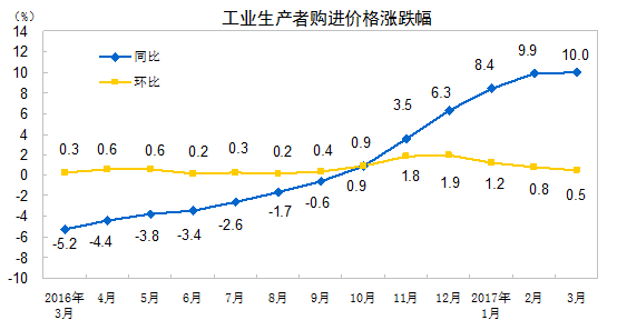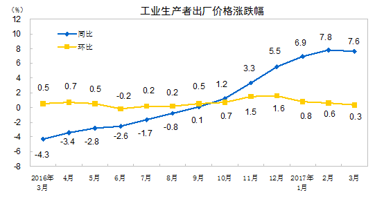 2017年3月份,全国工业生产者出厂价格同比上涨7.6%,环比上涨0.3%。工业生产者购进价格同比上涨10.0%,环比上涨0.5%。一季度,工业生产者出厂价格同比上涨7.4%,工业生产者购进价格同比上涨9.4%。
