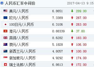 中国人民银行授权中国外汇交易中心公布,2017年4月13日银行间外汇市场人民币汇率中间价为:1美元对人民币6.8651元,1欧元对人民币7.3389元,100日元对人民币6.3106元,1港元对人民币0.88339元,1英镑对人民币8.6282元,1澳大利亚元对人民币5.1828元,1新西兰元对人民币4.8057元,1新加坡元对人民币4.9292元,1瑞士法郎对人民币6.8613元,1加拿大元对人民币5.1913元,人民币1元对0.64389马来西亚林吉特,人民币1元对8.2307俄罗斯卢布,人民币1元对1.9599南非兰特,人民币1元对165.26韩元,人民币1元对0.53422阿联酋迪拉姆,人民币1元对0.54546沙特里亚尔,人民币1元对42.5970匈牙利福林,人民币1元对0.57912波兰兹罗提,人民币1元对1.0140丹麦克朗,人民币1元对1.3051瑞典克朗,人民币1元对1.2426挪威克朗,人民币1元对0.53072土耳其里拉,人民币1元对2.6985墨西哥比索