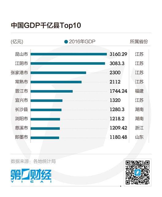 记者统计发现,截至2016年,已有21个县(县级市)的GDP突破了千亿大关,在数量上比去年增加了2个,分布在江苏、山东、浙江、福建、湖南、内蒙古六个省份,大多数位于沿海地区。分省份看,江苏最多,共有8个之多,山东紧随其后,共有5个,经济第一大省广东则无县入围。