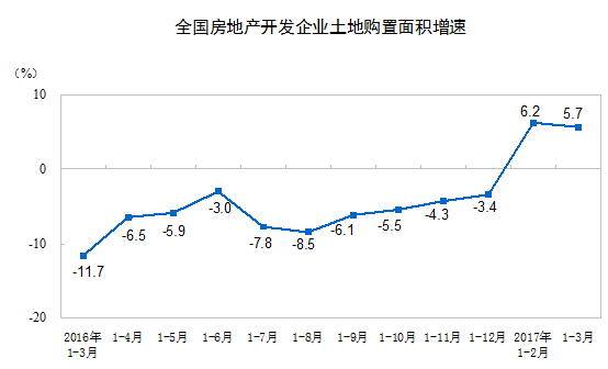 1-3月份,房地产开发企业土地购置面积3782万平方米,同比增长5.7%,增速比1-2月份回落0.5个百分点;土地成交价款1359亿元,增长16.7%,增速提高4个百分点。