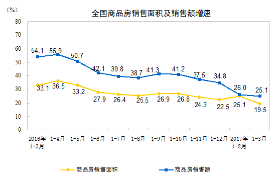 1-3月份,商品房销售面积29035万平方米,同比增长19.5%,增速比1-2月份回落5.6个百分点。其中,住宅销售面积增长16.9%,办公楼销售面积增长52.9%,商业营业用房销售面积增长35.6%。商品房销售额23182亿元,增长25.1%,增速回落0.9个百分点。其中,住宅销售额增长20.2%,办公楼销售额增长67.9%,商业营业用房销售额增长49.3%。