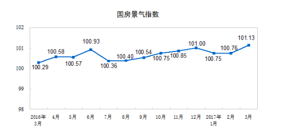 3月份,房地产开发景气指数(简称“国房景气指数”)为101.13,比2月份提高0.37点。