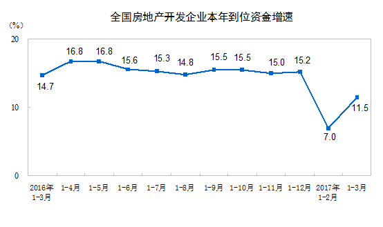 1-3月份,房地产开发企业到位资金35666亿元,同比增长11.5%,增速比1-2月份提高4.5个百分点。其中,国内贷款6892亿元,增长10.7%;利用外资74亿元,增长308.0%;自筹资金10894亿元,下降7.2%;其他资金17806亿元,增长27.1%。在其他资金中,定金及预收款10007亿元,增长27.0%;个人按揭贷款5538亿元,增长18.6%。