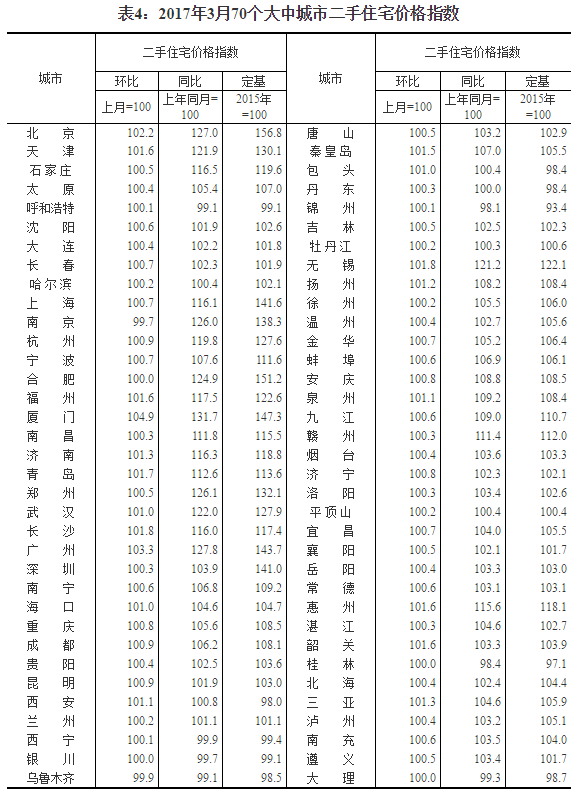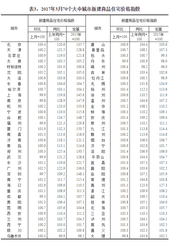 统计局今日公布2017年3月份70个大中城市住宅销售价格变动情况,数据显示,3月份70城新建住宅价格指数中,8座城市环比下降,分别为上海、南京、福州、武汉、深圳、成都、大理、丹东。
