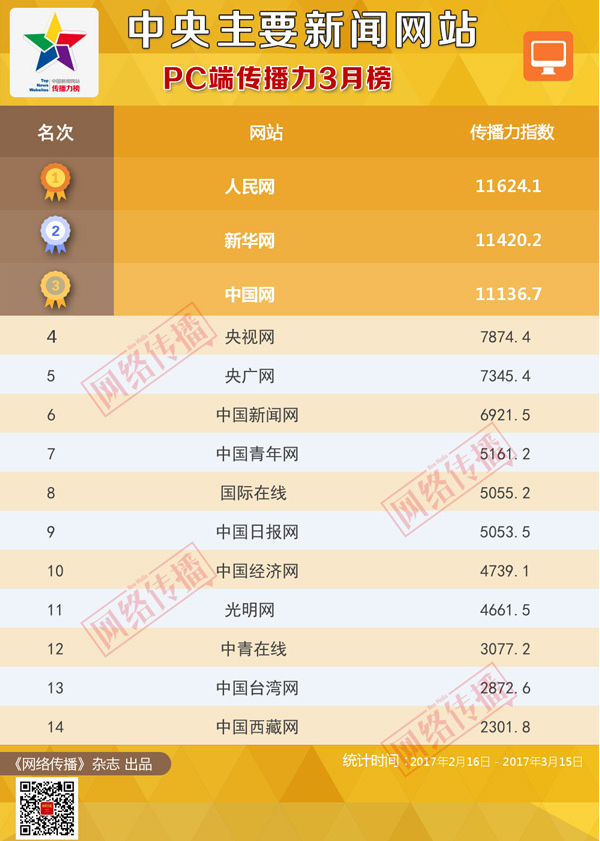 中央网信办《网络传播》杂志倾力打造的“中央主要新闻网站传播力2017年3月榜”今日发布。