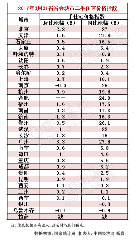 中国经济网北京4月19日讯(记者 杨淼) 国家统计局日前发布了2017年3月份70个大中城市住宅销售价格变动情况。据中国经济网统计,3月二手房市场企稳回升,26个省会城市环比小幅上涨,但是二手房同比涨幅并不乐观,多省城同比涨幅持续回落。