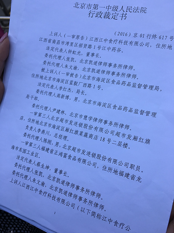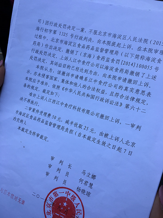 北京市第一中级人民法院的行政裁定书内容显示,海淀区食药监局已撤销对江中此前的行政处罚决定。 澎湃新闻记者 王文秋 图