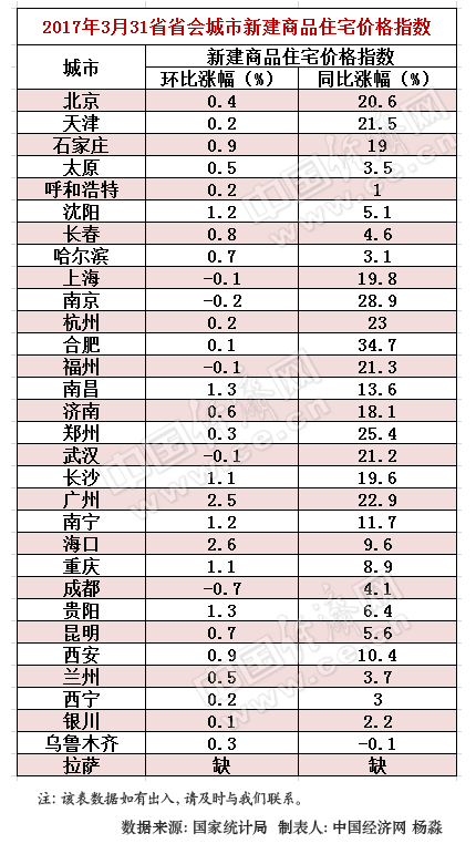 中国经济网北京4月20日讯(记者 杨淼) 国家统计局日前发布了2017年3月份70个大中城市住宅销售价格变动情况,中国经济网通过汇总31省省会城市新建商品住宅价格指数发现,除了拉萨相关数据没有公布以外,与去年同期相比,除了乌鲁木齐新建商品住宅价格同比下降0.1%以外,其它29个城市均上涨。