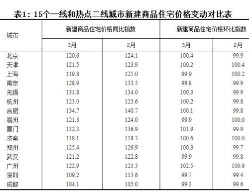 国家统计局城市司高级统计师刘建伟表示,3月份是房地产传统销售旺季,但在因地制宜、因城施策的房地产调控政策作用下,15个一线和热点二线城市新建商品住宅价格环比总体平稳。