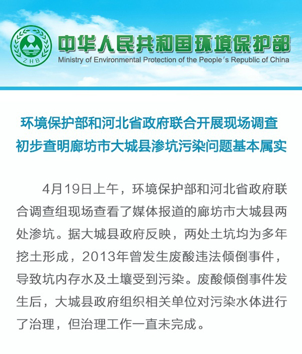 环保部:初步查明廊坊渗坑污染问题基本属实,曾发生废酸倾倒