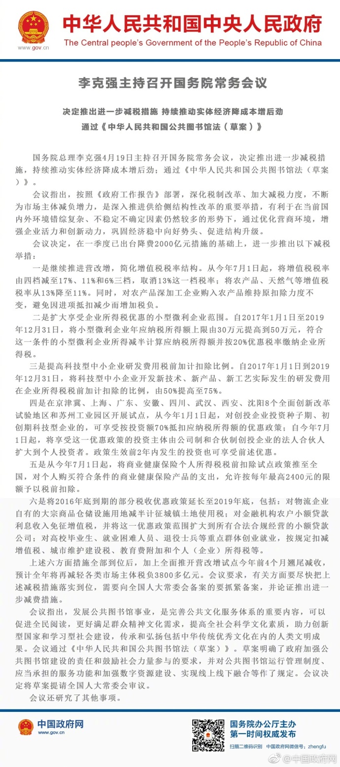 据中国政府网官方微博消息,国务院总理李克强4月19日主持召开国务院常务会议,决定推出进一步减税措施,持续推动实体经济降成本增后劲。