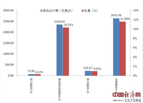 从数据上来看,2006年至2015年中国版权产业的商品出口额出现波动,占全国商品出口总额的比重从15.40%下降到11.58%。但总体上看,出口规模有所扩大,十年间增长了近一倍,2015年商品出口额达2633.36亿美元。