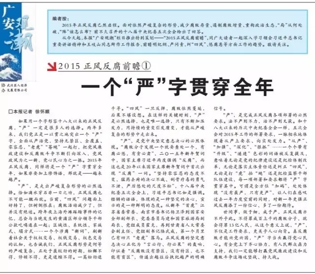 党的十八大以来,全面从严治党上升为战略部署,正风反腐力度空前,覆盖各个领域,成为举国上下和境内外关注的热点。再加上十八届中央纪委力推“去神秘化”,主动和媒体接触,提高工作透明度。作为中央纪委机关报的中国纪检监察报,报道资源也更加丰富。经过多次研究,从人员少、体量小的实际出发,报社决定扬长避短,拼观点、拼视角、拼深度。2014年10月,《广安观潮》应运而生。