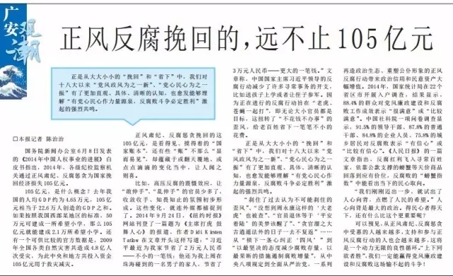 《正风反腐挽回的,远不止105亿元》就是其中的一篇代表作。2015年6月8日,国新办发表《2014年中国人权事业的进展》白皮书披露:2014年,各级纪检监察机关通过正风肃纪、反腐惩贪为国家挽回经济损失105亿元。《广安观潮》栏目主创人员在讨论选题时认为,这个数据就是新闻。《正风反腐挽回的,远不止105亿元》以105亿元为切入点,从讲明白国家的“大账”,到算一算个人的“小账”,层层深入,用事例、细节启发人们思考反腐惩贪的收益账、受益人。