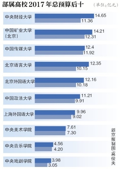 预算最少的后三位是中央美术学院、中央音乐学院和中央戏剧学院,均为艺术类院校,预算总额均未超10亿元。