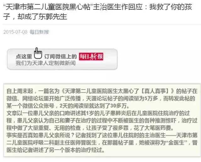 2015年7月,我当时在《每日新报》的新媒体部,偶然从朋友圈里看到一篇帖子,一个患儿家长控诉天津市第二儿童医院某医生黑心医疗,帖子引起了很多孩子家长的共鸣,在朋友圈里渐呈刷屏趋势。