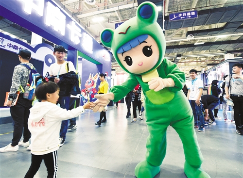 近日,第13届中国国际动漫节在杭州举行。图为卡通人偶在动漫节上与一名小朋友握手互动。李 忠摄 (新华社发)