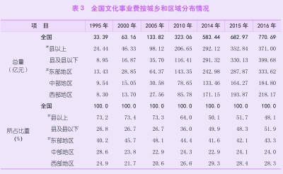 全国文化事业费中,县以上文化单位371.00亿元,占48.1%,比重比上年降低了3.6个百分点;县及县以下文化单位399.68亿元,占51.9%,比重比上年提高了3.6个百分点。东部地区文化单位文化事业费333.62亿元,占43.3%,比重提高了1.2个百分点;中部地区文化单位184.80亿元,占24.0%,比重下降了0.1个百分点;西部地区文化单位218.17亿元,占28.3%,比重下降了0.1个百分点。