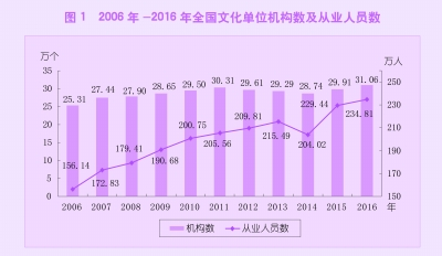 2016年末,纳入统计范围的全国各类文化(文物)单位31.06万个,比上年末增加1.15万个;从业人员234.81万人,增加5.37万人。其中,各级文化文物部门所属单位66029个,增加319个;从业人员66.10万人,增加1.56万人。